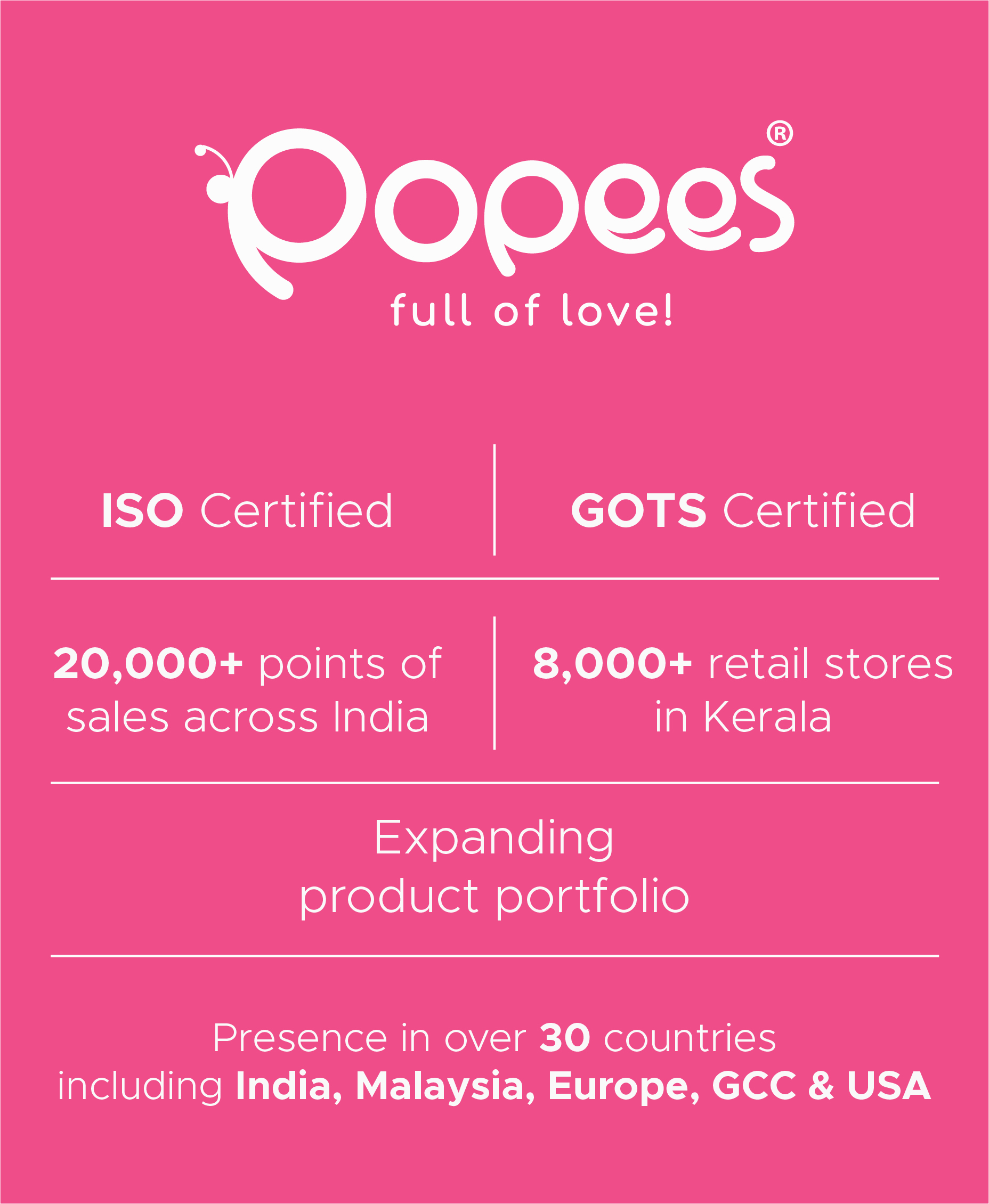 Popees was born in 2003 at Thiruvali in the Malappuram District of Kerala, out of the need for a quality kids' clothing brand with affordable prices. Mr.Shaju Thomas fathered Popees with his vision to make the company the Most Trusted Baby Care Brand.